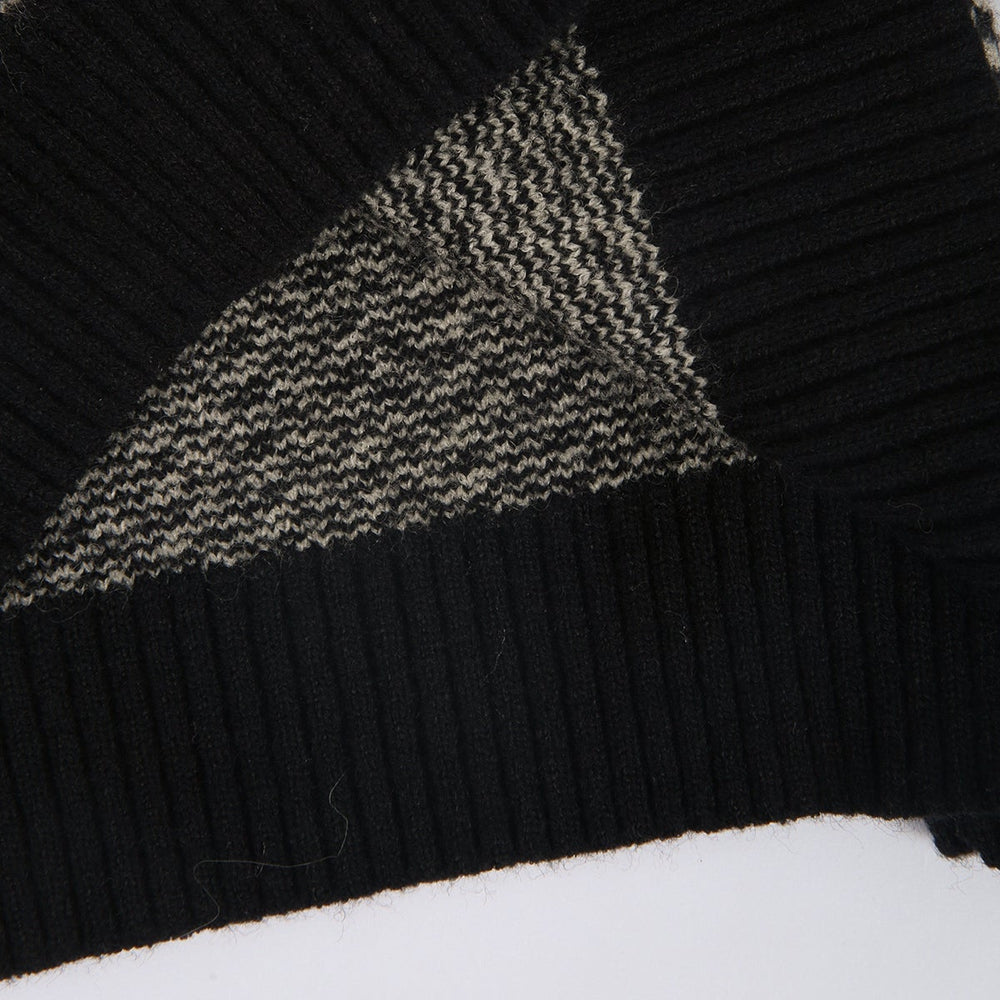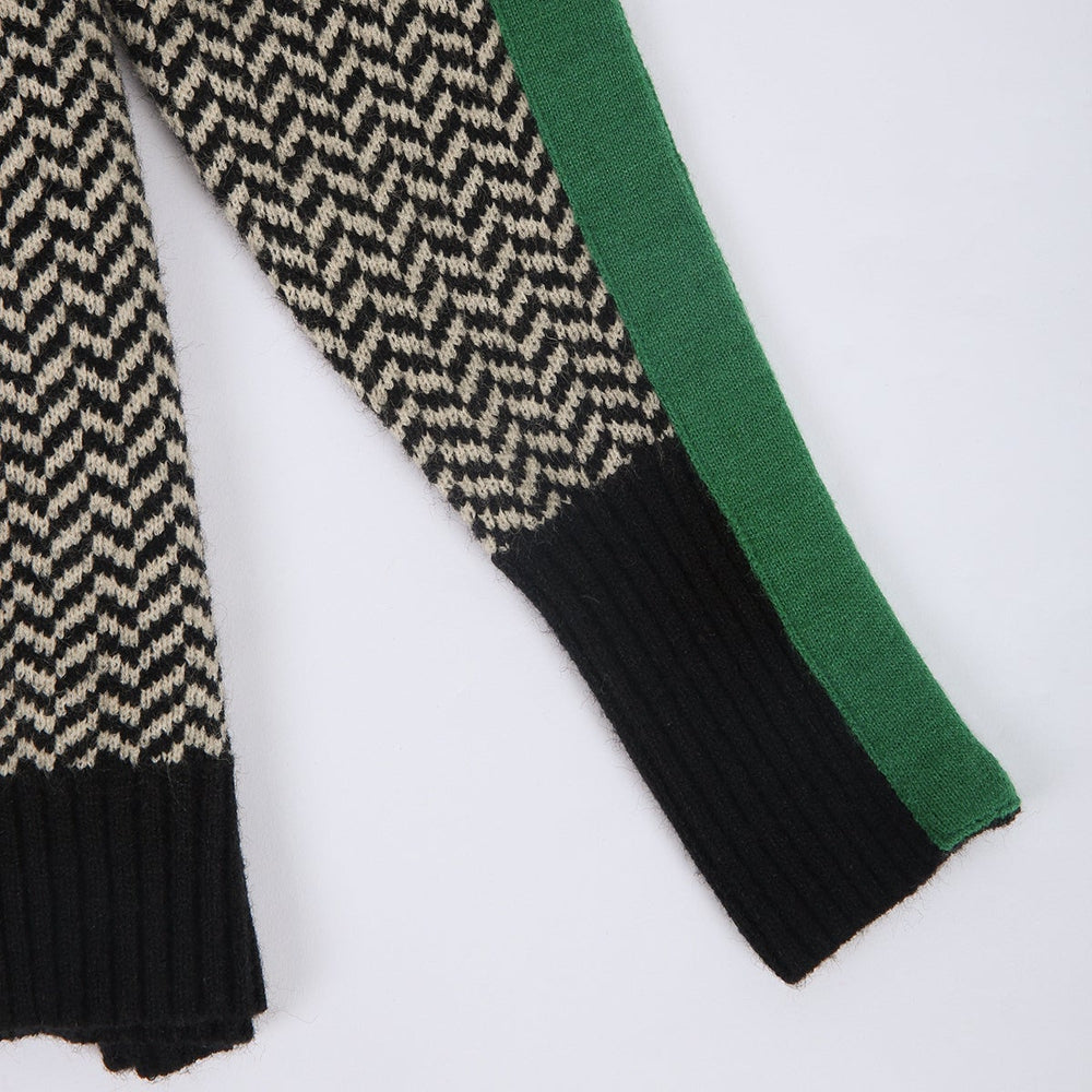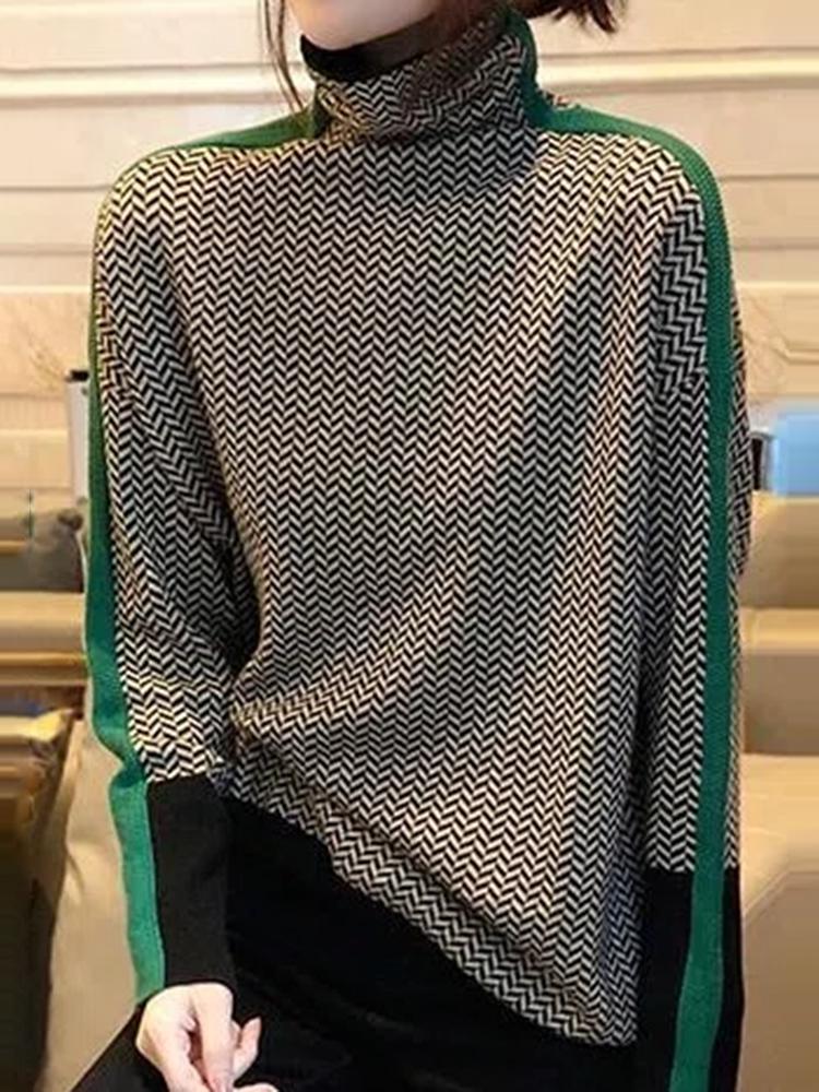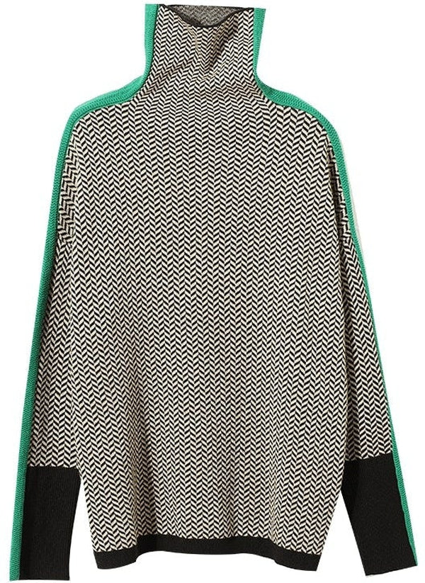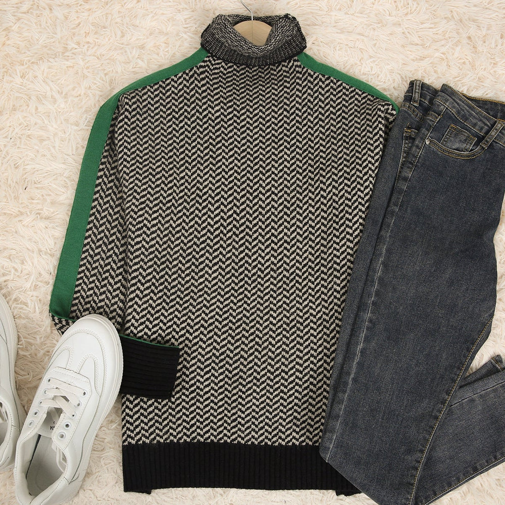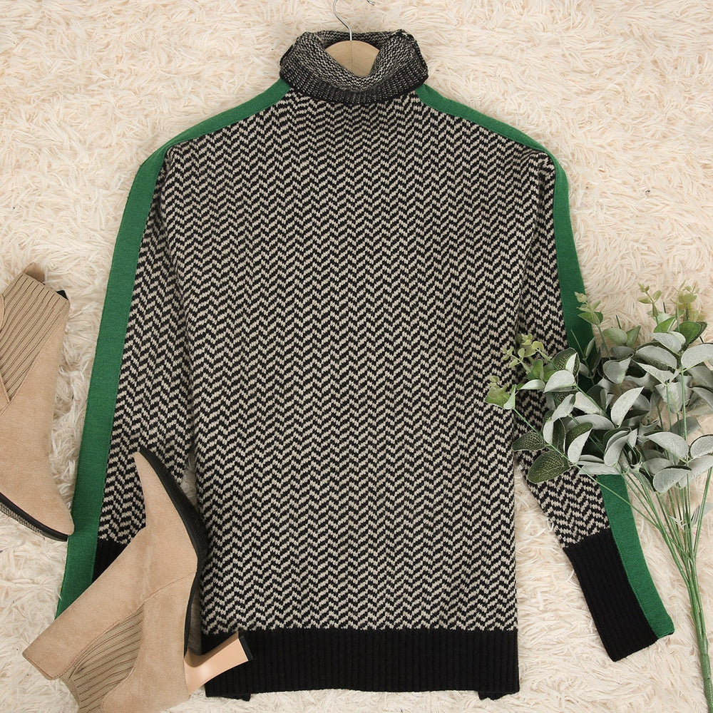 This lightweight and cozy long-sleeved turtleneck is just in time for the colder months ahead. A sophisticated black and white chevron print with dark forest green stripes on the sleeves refresh your winter wardrobe with a chic yet elegant look, perfect for wearing to a dinner party, the office, and so much more. Machine wash normal with light colors or hand wash. Bleach if needed. May be hung up to dry or lay flat. Tumble dry with low heat. Light ironing if needed.
