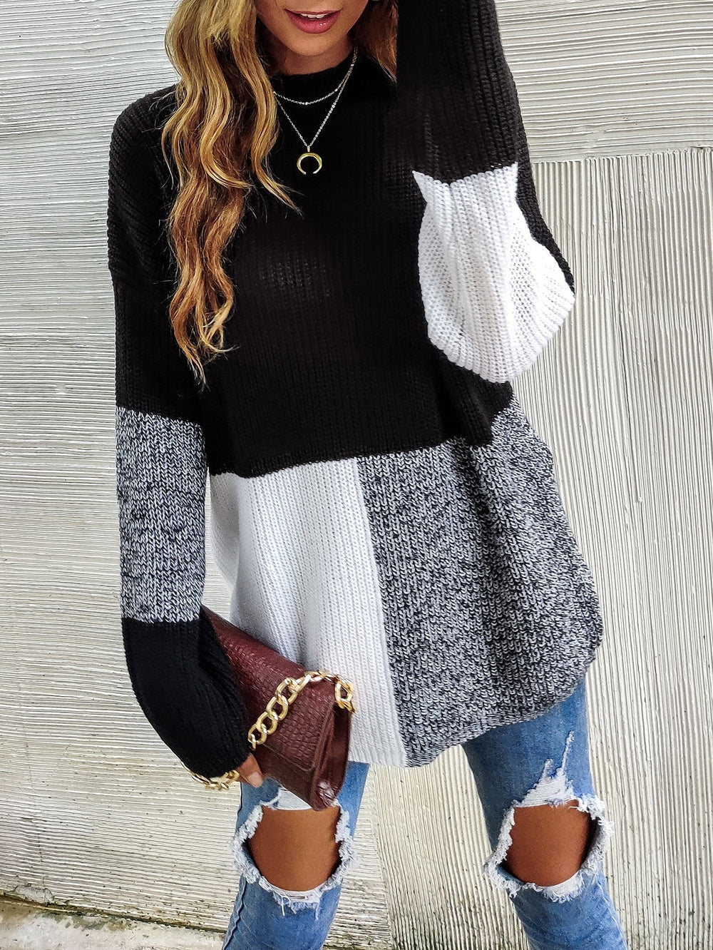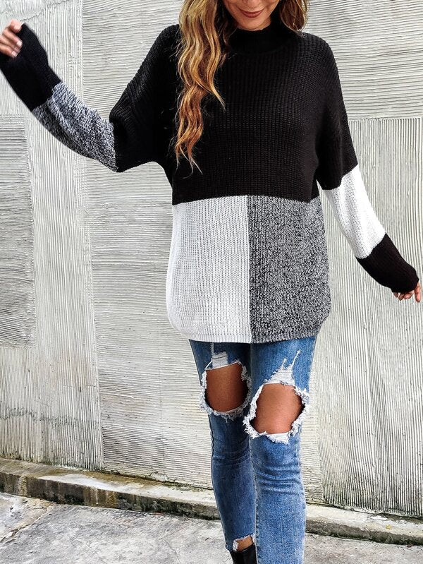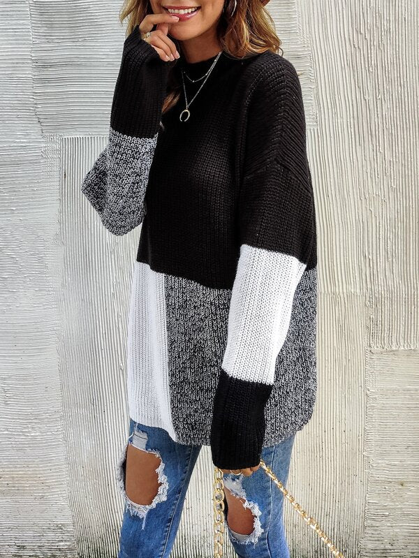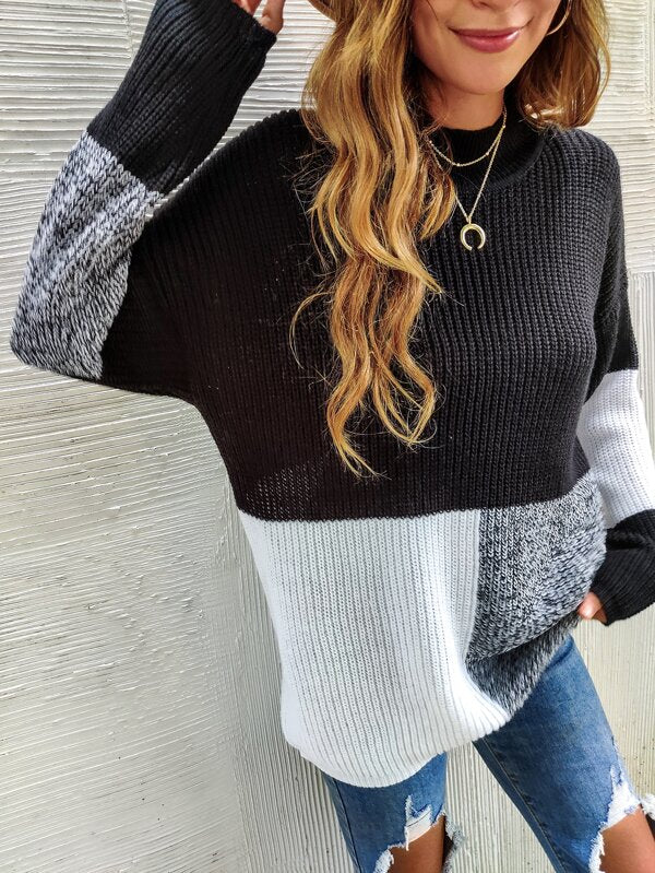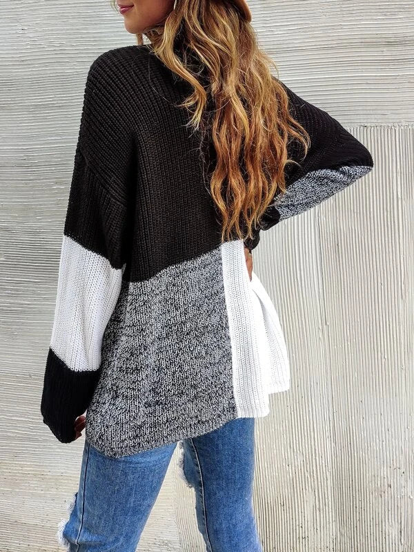 This Black And White Color Block Sweater features two solid colors that blend together for a sleek, stylish look. Its soft, lightweight fabric is perfect for transitioning from summer to fall, while its classic cut ensures a flattering fit.